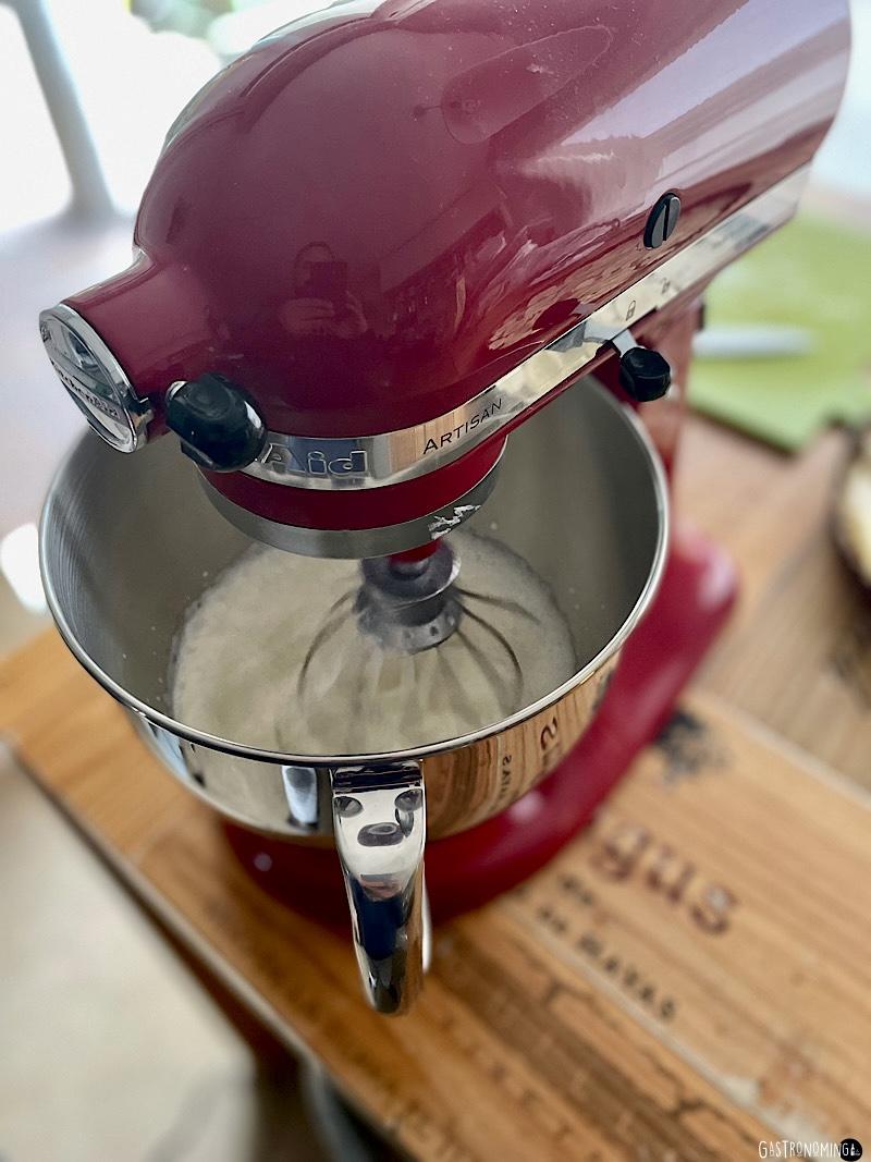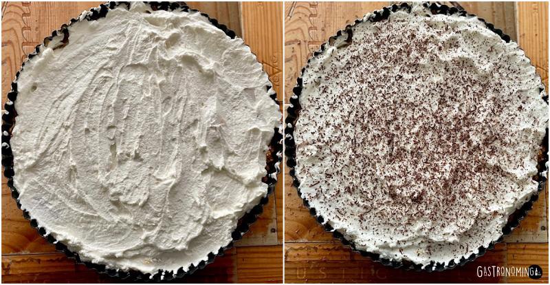 5. Por otro lado, montamos la nata (crema de leche) con el azúcar hasta que esté densa, colocamos encima de la tarta cubriendo bien.