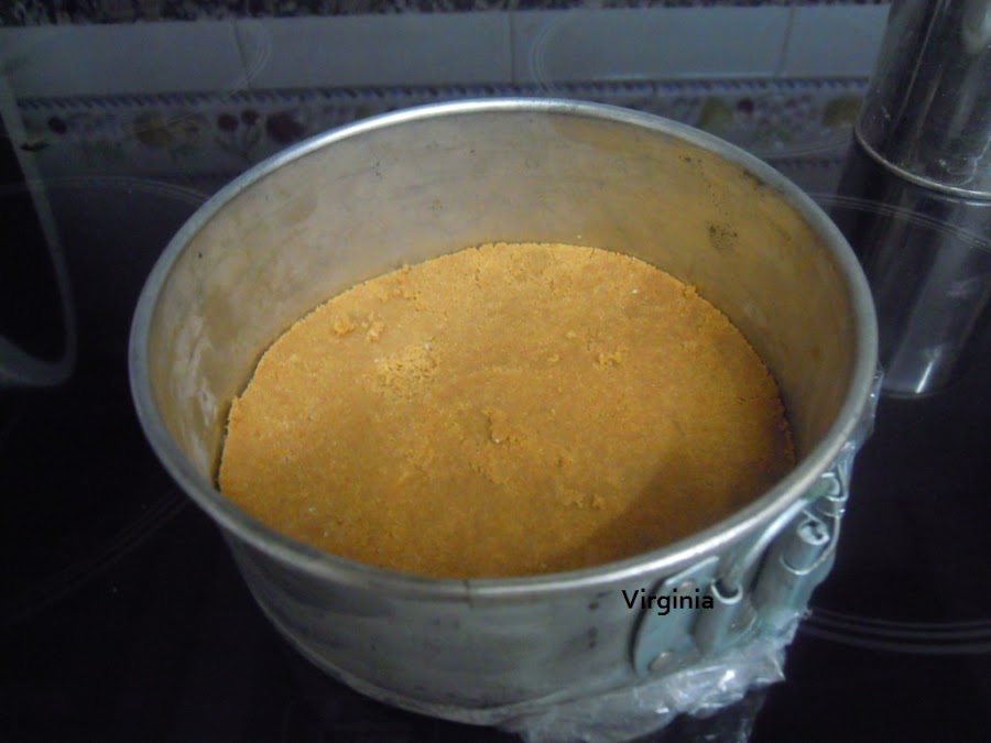 2.- Coloca esta pasta en un molde desmontable y aplastala bien con la cuchara para que se compacte. Debe quedar una capa no demasiado fina para que luego se note el contraste de sabores y texturas. Mete al frigorifico mientras continuas con la receta.
