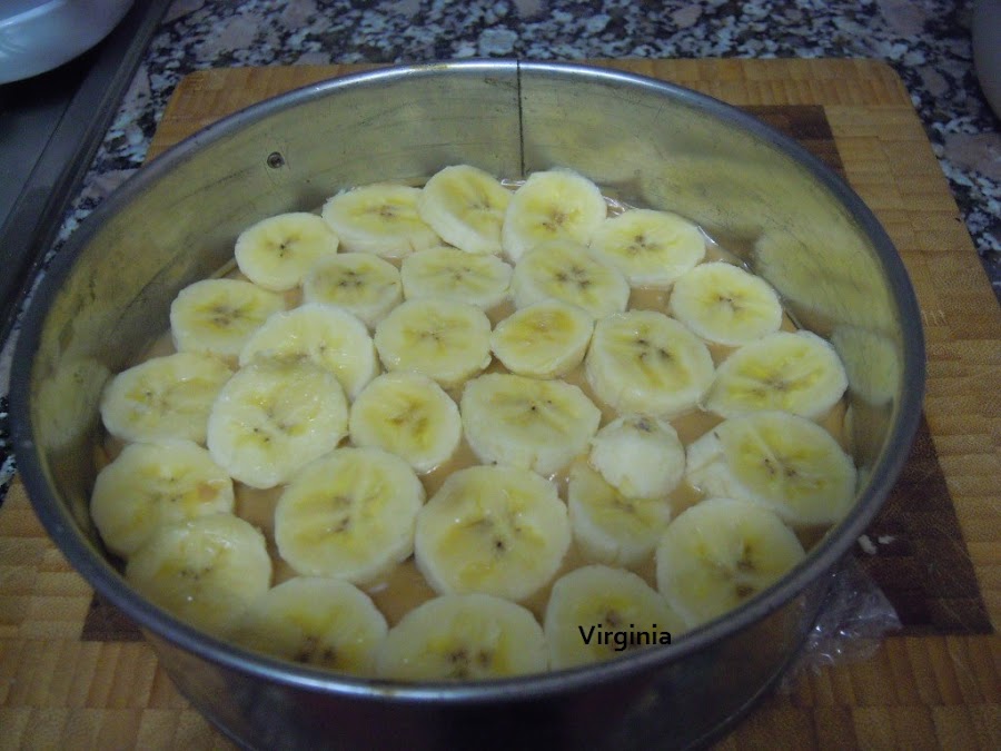 4.- Sobre el toffee pones el platano a ruedas como de 1 centimetro de grosor aprox. que cubra toda la superficie y sin montar unos sobre otros.