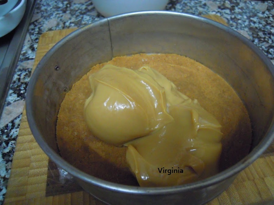 3.- Cubre la capa de galletas con dulce de leche o bien prepara tu propio toffee: en una olla a presion cubierta de agua metes la lata de leche condensada durante unas dos horas, Apagas fuego y dejas enfriar . Una vez fria la sacas y abres la lata y te habra quedado caramelizada y espesa. Ese es el toffee. yo te recomiendo que lo hagas el dia anterior.