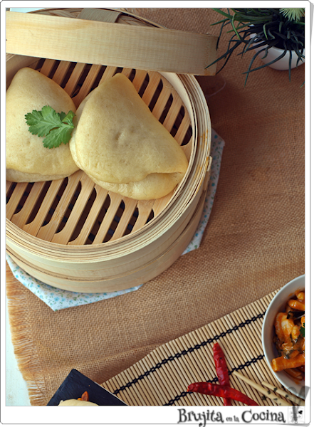 Preparamos la vaporera de bambú, para ello ponemos a hervir agua en una cazuela y cuando esté listo metemos los panecillos en la vaporera tapamos y ponemos sobre la cazuela 10 minutos. Apartamos y dejamos otros 10 minutos antes de sacarlos.