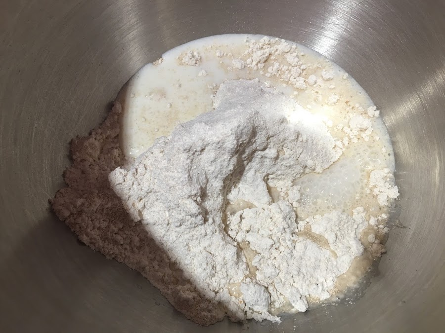 Mezclamos la levadura seca con el agua tibia (el agua tibia sirve para acelerar el proceso y se recomienda que el agua no esté a más de 40º). Tamizamos la harina y la añadimos al bol junto con la sal, el azúcar, la leche y el agua con la levadura.