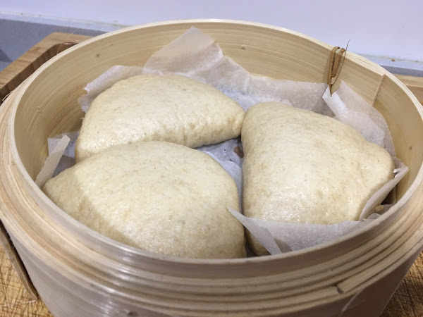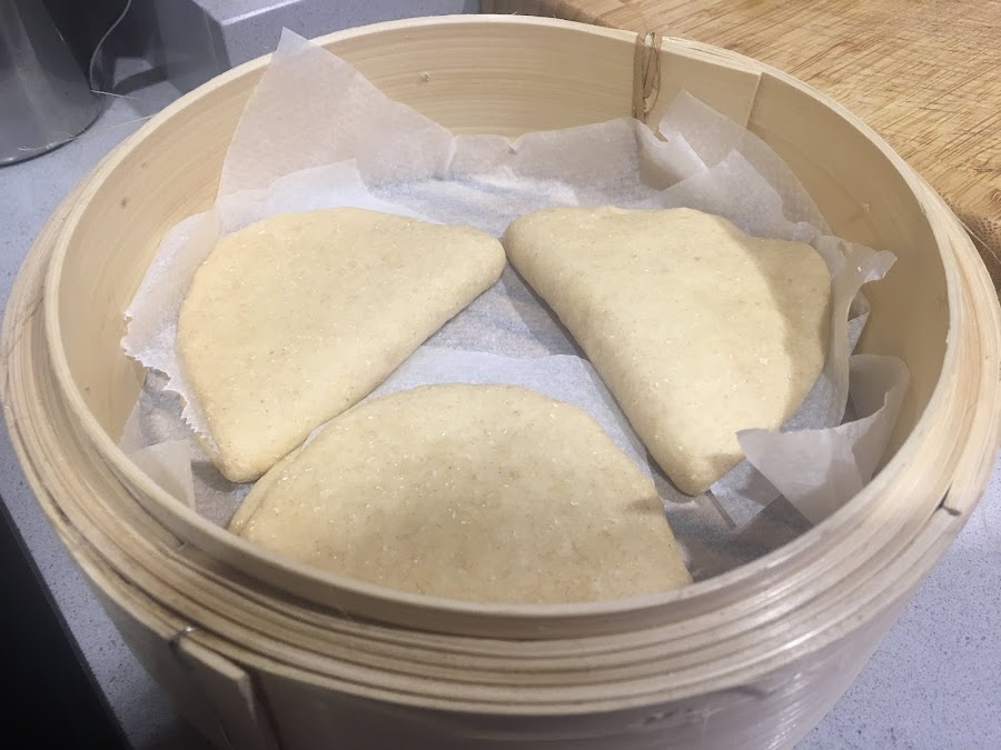 8. Una vez tenemos el relleno listo y los Bao han fermentado, volvemos a poner una olla con agua hirviendo y cocemos nuestro bollitos en la vaporera. Mi vaporera es de 20cm, cogen 3 unidades. Os recomiendo poner papel en la base para evitar que se nos peguen. Los dejamos al vapor durante 10 minutos. Pasado este tiempo, retiramos la vaporera de la olla y dejamos reposar 5 minutos más dentro de la vaporera cerrada para que los panecillos se asiente y no se desinflen.