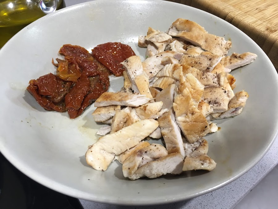 7. En una sartén caliente hacemos las pechugas de pavo a la plancha. Una vez hechas las cortamos a tiras finas. Preparamos el tomate deshidratado.