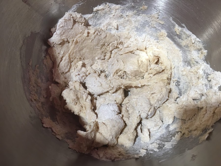 2. Amasamos, al principio, la mezcla se ve seca y aunque parece que se necesite añadir más líquido, no es así, tan solo hay que seguir amasando hasta que se despegue del bol. Justo en ese momento añadimos el aceite de oliva y amasamos hasta formar una masa lisa y suave.