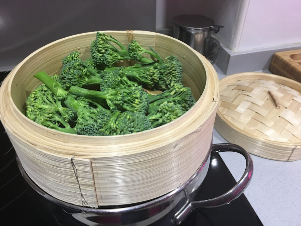 6. Mientras nuestros bao fermentan preparamos el Bimi. Lo vamos a preparar también al vapor. Preparamos una olla con agua hirviendo y cocemos nuestros tallos de Bimi en la vaporera. Según indica con 4 minutos es suficiente, crujiente y delicioso.