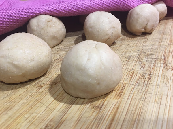 4. Dividimos la masa en porciones de 50g aproximadamente, boleamos y dejamos reposar 10 minutos, saldrán 8 porciones.