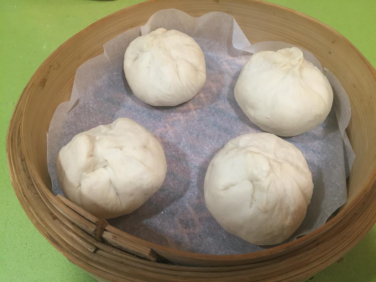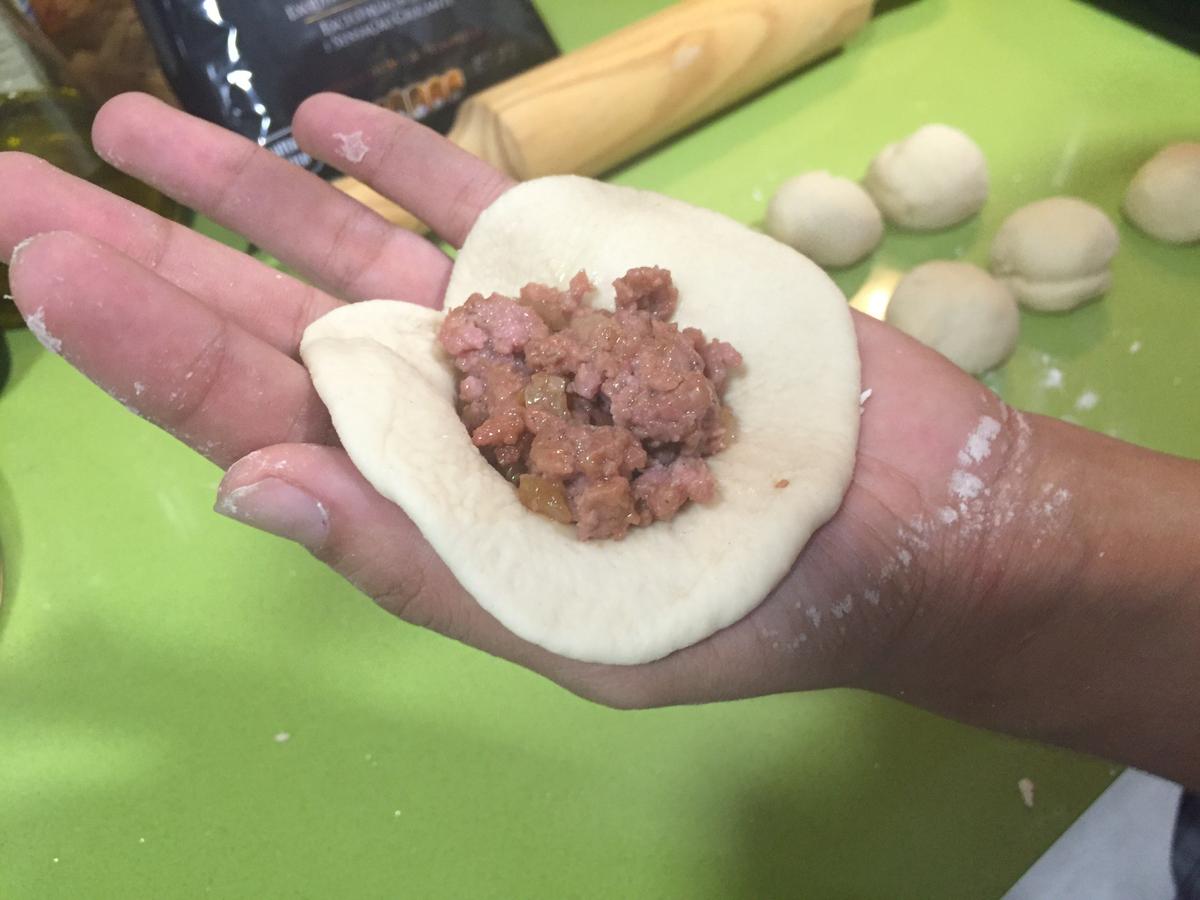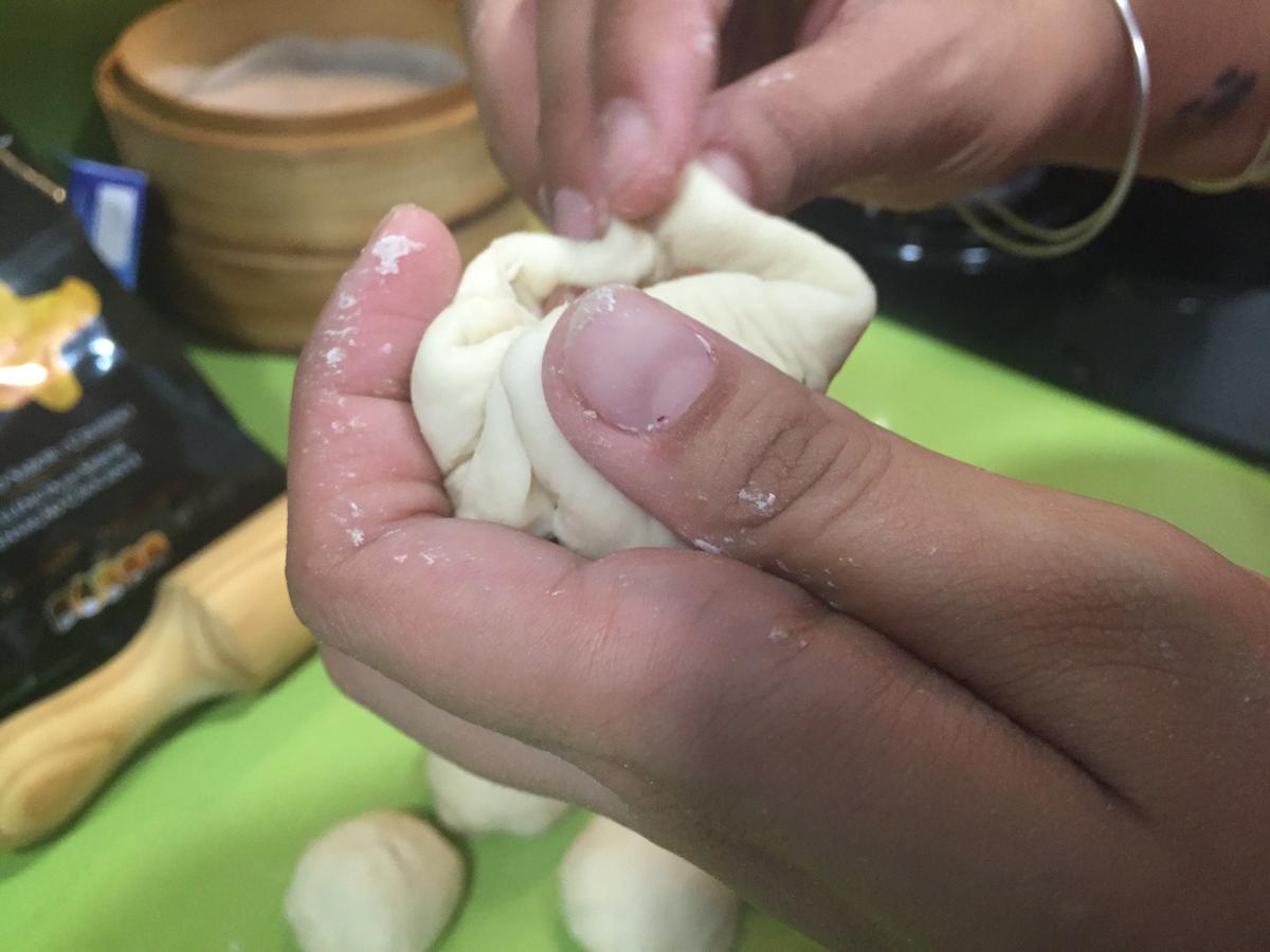 Haremos ahora bolas con la masa de 40 gr mas o menos. Y con un rodillo hacemos placas redondas sin que sean perfecta. Ponemos en el centro una cucharadita grande en el centro y cerraremos por los lados para que quede el relleno en el centro y vamos colocando en la vaporera con un papel de horno debajo para que no se peguen al bambú. Hacemos el mismo proceso una y otra vez y sobre todo no peguéis mucho los baos ya que como crecen luego se pegan.