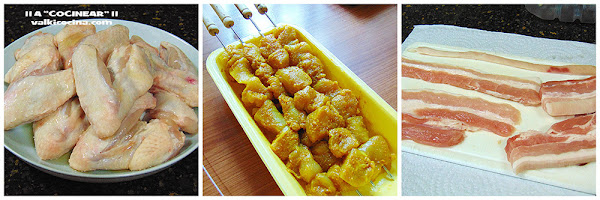 A las alitas de pollo es conveniente quitarles la punta, ya que si no quedarán levantadas al hacerlas por el lado de dentro. Yo también les quito la grasa sobrante y las dejo ya listas con sal y embadurnadas en aceite, ( la carne de pollo es la única que sazono en crudo, al resto se la añado una vez cocinada o mínimo al dar la vuelta para que no pierda los jugos ). Suelen tardar en hacerse por lo que será lo primero que coloquemos en la barbacoa en una posición alta.