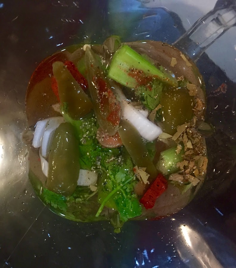 2.- En la licuadora colocamos todos los ingredientes restantes, así es colocamos la media cebolla, las hojas de laurel, el orégano, la pimienta, el cilantro, 4 dientes de ajo, media vara de apio, 4 chiles jalapeños, 1 cucharadita de vinagre, 1 chile verde, 4 aceitunas, una cucharadita de chile colorado en polvo y un trozo de aproximadamente 2x2 cms de achiote y dos tazas de agua, licuamos todos los ingredientes si crees que le hace falta agua puedes agregarle una taza más.