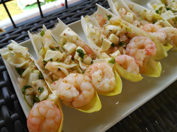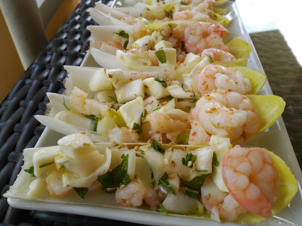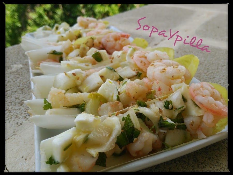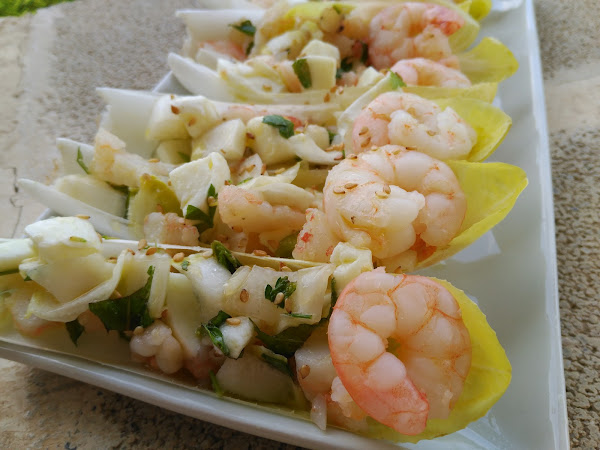 - Rellenamos las hojas de endivia reservadas, decoramos con las gambas reservadas y espolvoreamos sésamo.