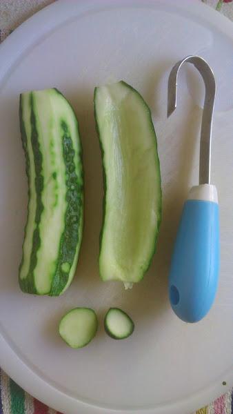 Lavamos los pepinos y pelamos parcialmente. Los vaciamos un poco con un sacabolas o vaciaverduras.