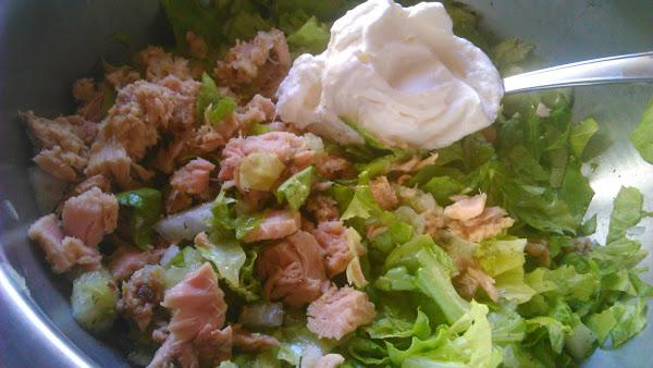 Picamos lo que le hemos sacado y la lechuga. Le añadimos el atún y la mahonesa. Salamos.