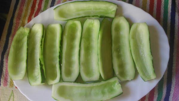 Salamos los pepinos, por la parte interior y los dejamos escurrir bocabajo mientras preparamos el relleno.