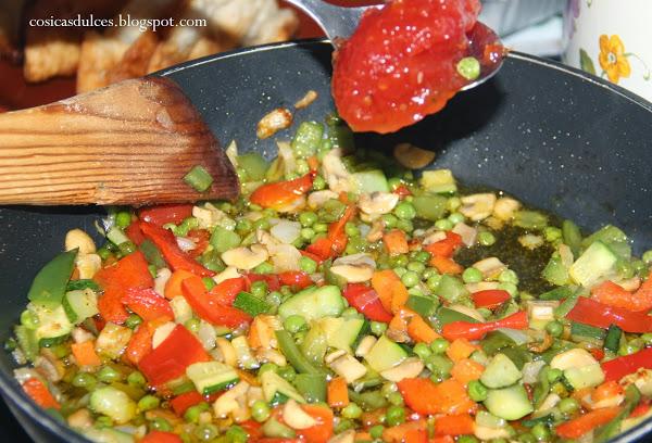 Comenzamos por freir las obleas.Lo hacemos sujetándolas con una pinza (primero por un lado y luego por otro) de forma que queden con forma de barca. Una vez doradas, retiramos y reservamos. Seguidamente limpiamos la verdura (al calabacín le dejamos la piel) y la cortamos en bastoncillos. La ponemos en una sartén con aceite y cuando esté ligeramente pochada añadimos la mermelada de tomate.