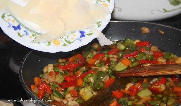 Seguidamente, y ya fuera del fuego, incorporamos el queso en escamas.