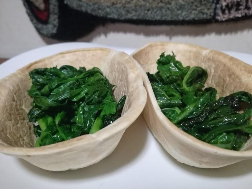 Coje unas barquillas y coloca los grelos cocidos en el fondo de la barquilla.