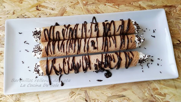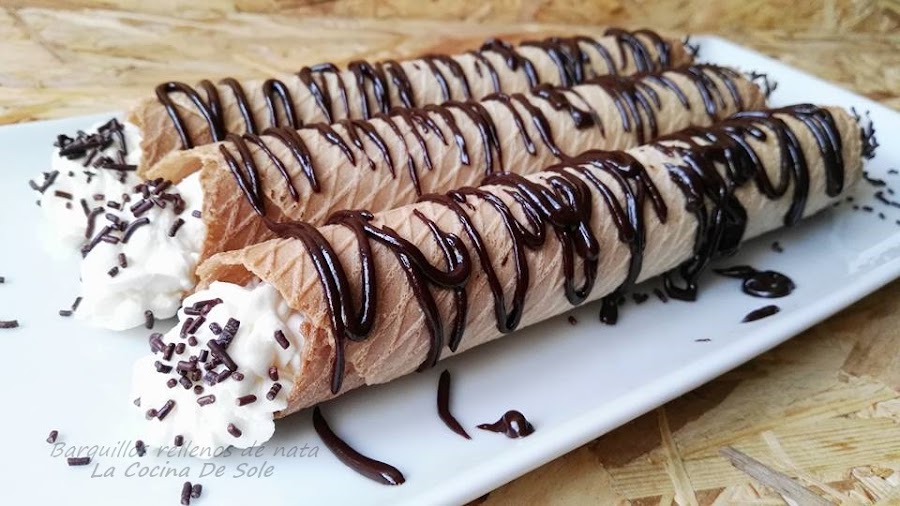 He utilizado barquillos de Xandra artesanos, que por si solos están riquísimos pero, que presentados con nata (crema de leche) y chocolate están de miedo.