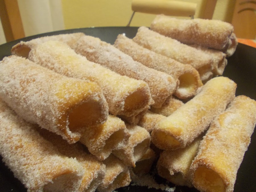 Esta receta es de unos dulces que hacía la abuela de mi marido, ayer recordó que hace muchos años que no los comía, así que nos hemos puesto manos a la obra, hemos recuperado la receta y nos han salido geniales. Y lo bueno es la joya con las que las hemos hecho, las cañas que eran de mi abuela, pues ella también las hacía, aunque mi abuela era de un pueblecito de Cáceres, que se llama Calzadilla, y la abuela de mi marido de un pueblecito de Ciudad Real, que se llama Cabezarados. En fin, aunque la receta de una a otra varía en muy poquito, es lo mismo, y hoy hemos hecho la receta de la abuela de mi marido, pues tenía muchas ganas de comerlas de nuevo. Han quedado riquísimas.