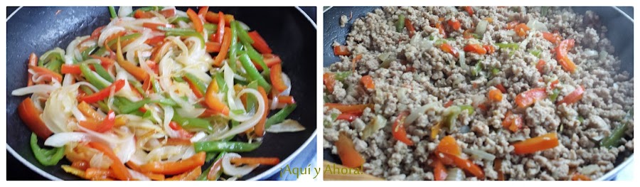Ponemos al fuego una sartén con aceite de oliva, añadimos las verduras cortadas en juliana, bajamos a fuego medio y le ponemos una pizca de sal. Cuando estén las verduras pochadas agregamos la carne picada, con la ayuda de una cuchara de madera le damos unos golpecitos para que la carne se separe y no queden apelmazados. Añadimos a la carne la especias y una pizca de sal, si fuese necesario. Removemos bien hasta que veamos que esté la carne lista y resevamos.