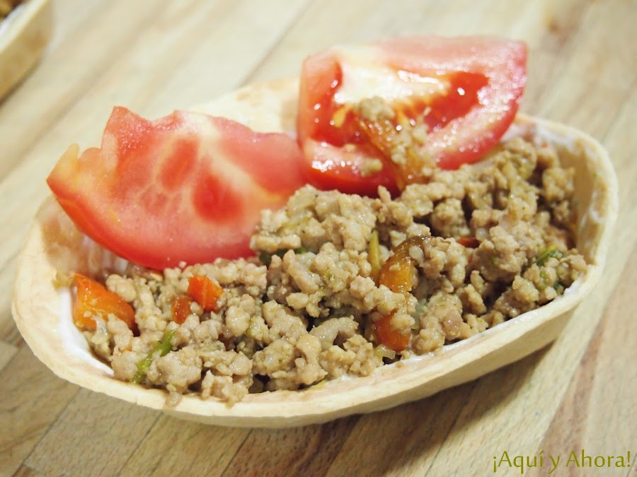 Untamos de mayonesa o alioli la base de las barquitas, añadimos la carne con las verduras, ponemos unas rodajas de tomate y unas hojas de canónigos.