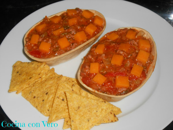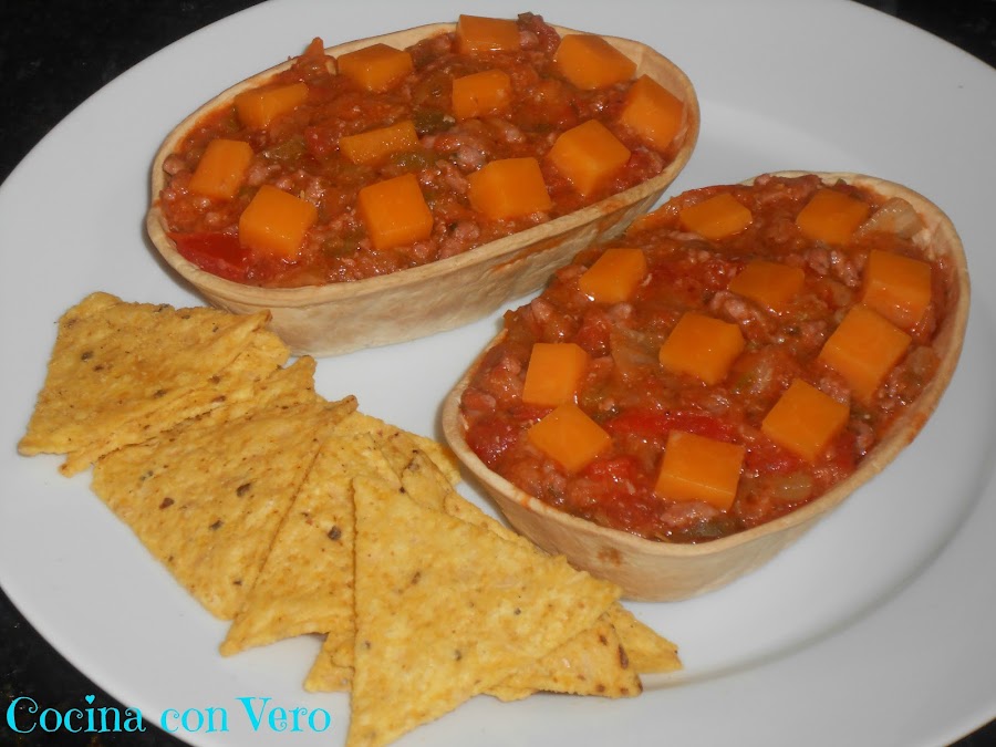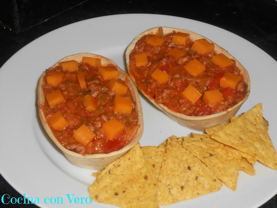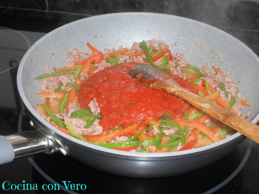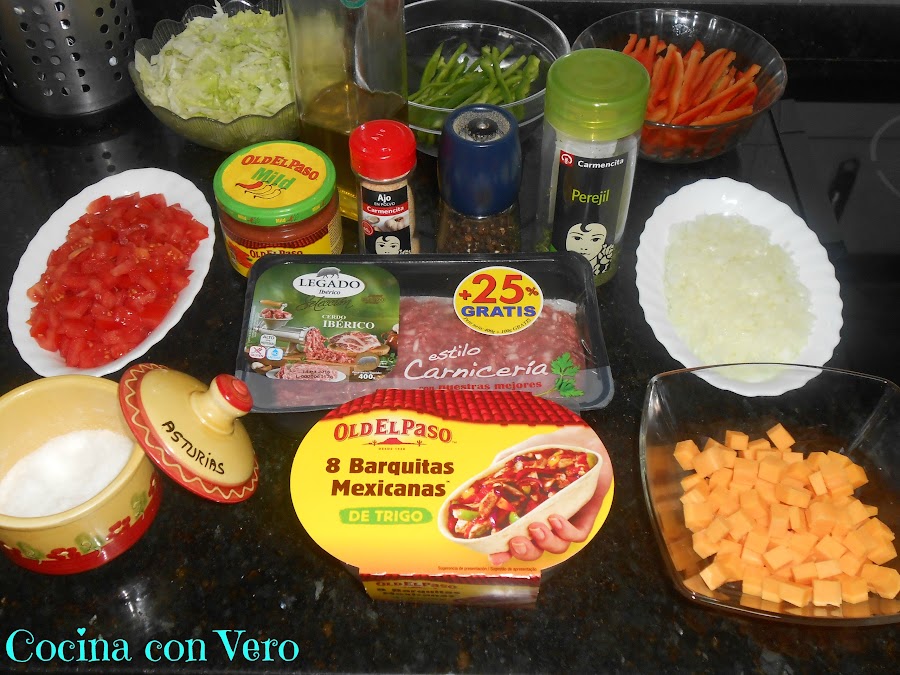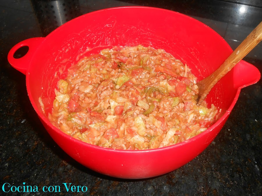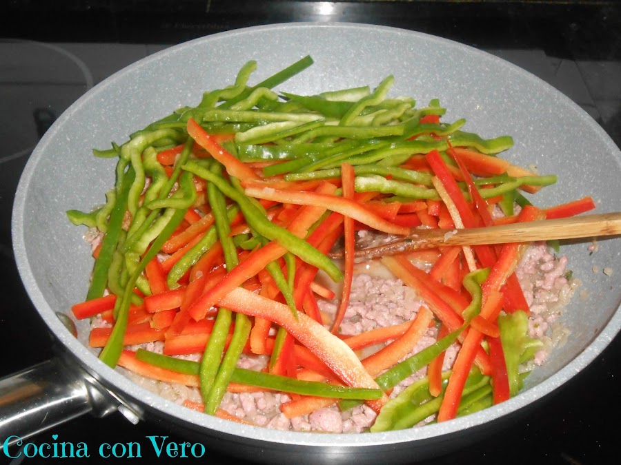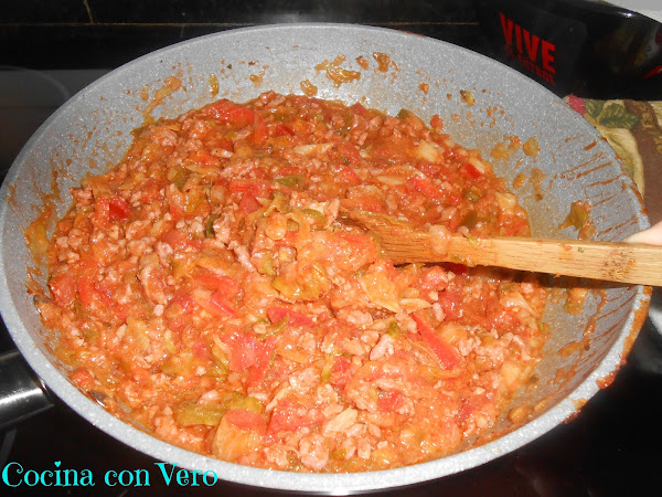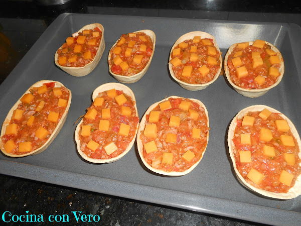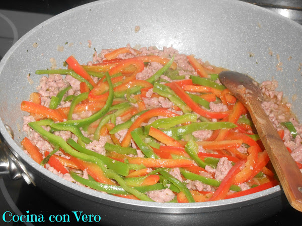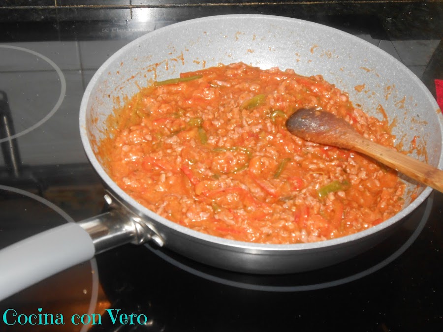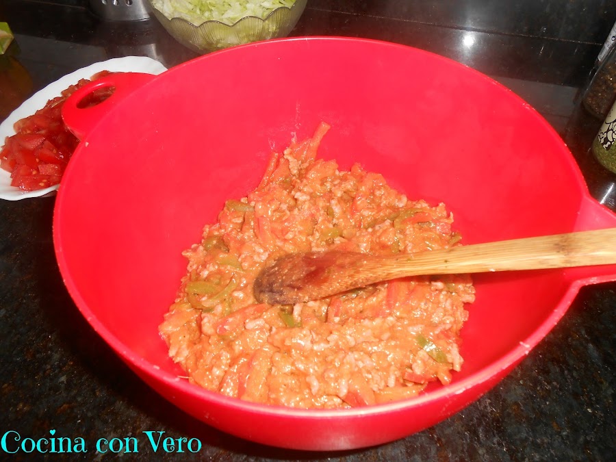 NOTA: Se pueden hacer en vez de carne picada, de pollo en trocitos o con pavo en cachitos pequeños. Si se quiere podemos incluir algo de picante (salsa) pero yo añadí la suave de Oldelpaso.