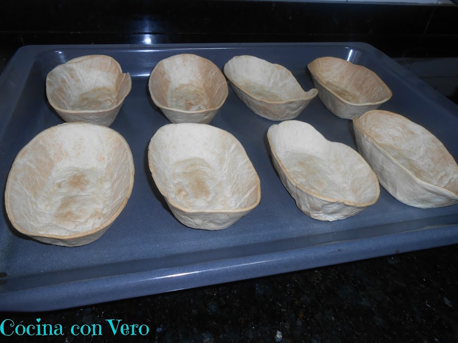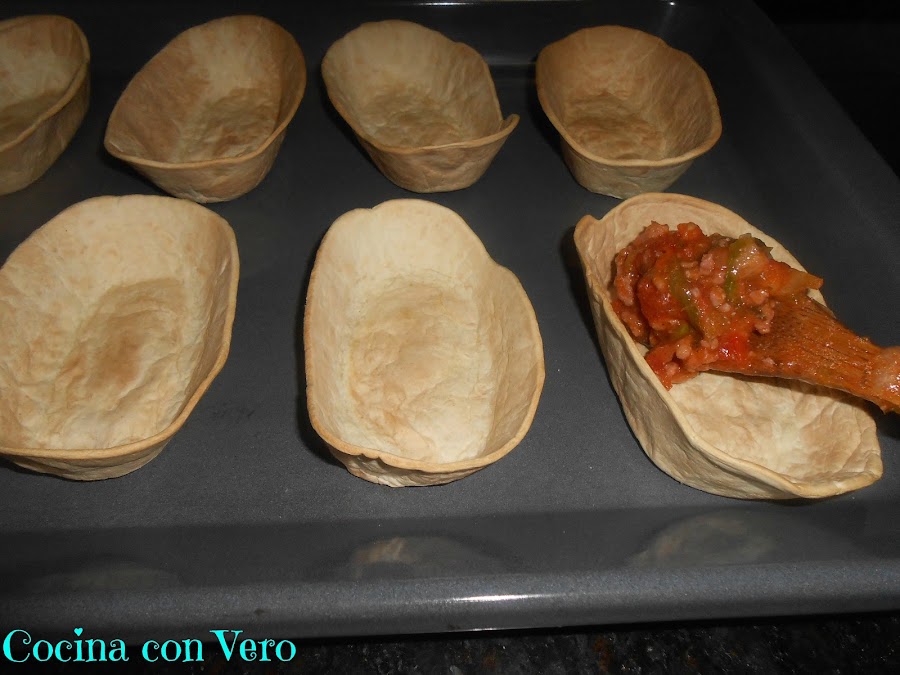 4/ Precalentamos el horno a 165ºC y cuando alcance esa temperatura metemos las barquitas sin rellenar por espacio de 7 min. aprox. con calor por arriba y por abajo y aire al medio.