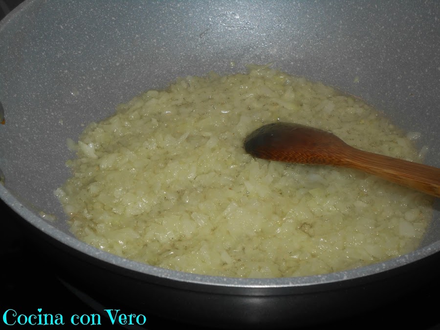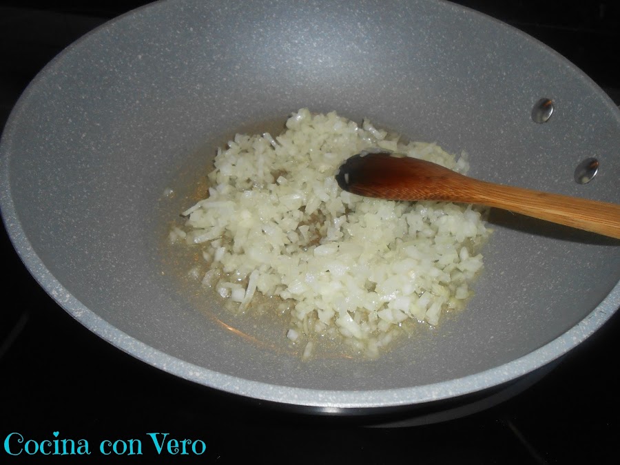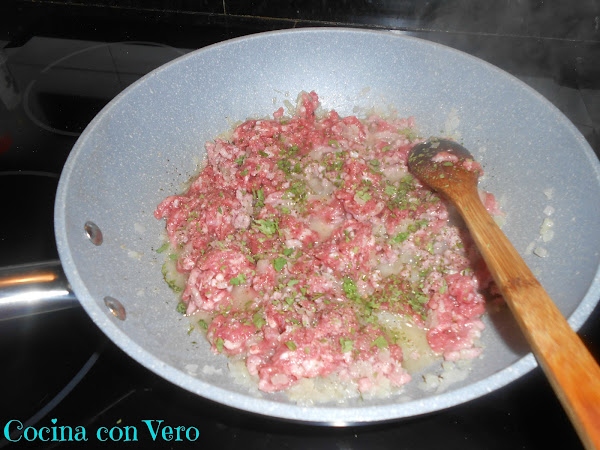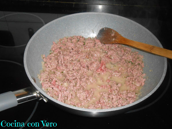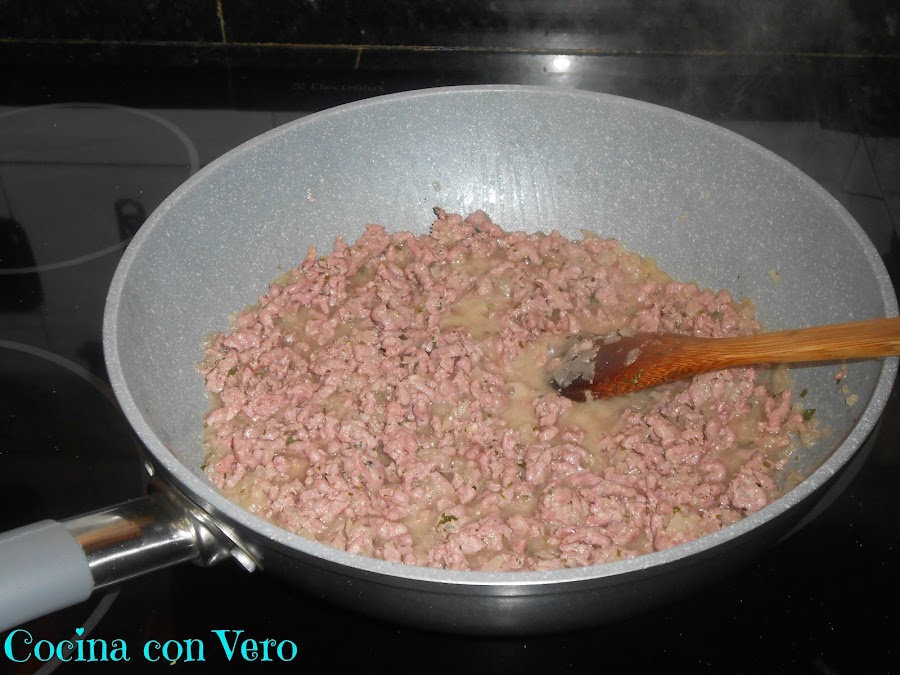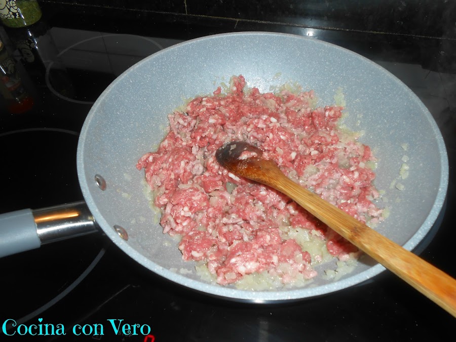 2/ Una vez que la cebolla esté pochada vamos a ir añadiendo la carne picada, desmenuzándola para que no se quede compacta, e ir un poco aplastándola, es decir, para que no nos quede como una bola.
