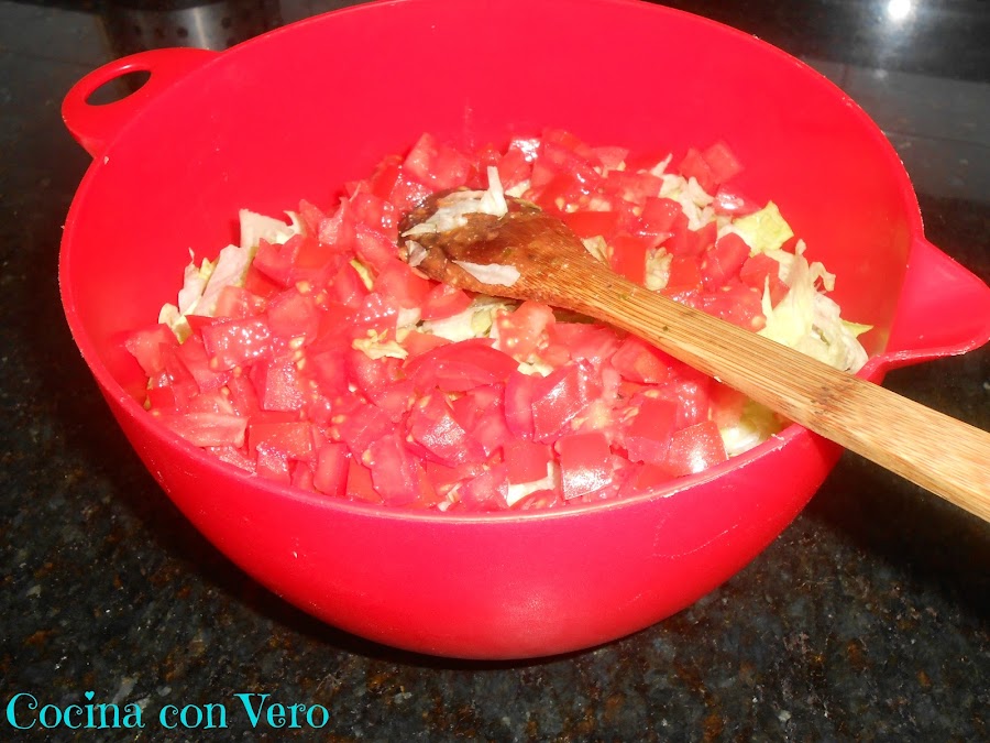 3/ Lo pasamos a un bol grande, echamos también la lechuga picada y el tomate en trocitos. Lo mezclamos haciendo movimientos de abajo hacia arriba para que se integre todo bien.