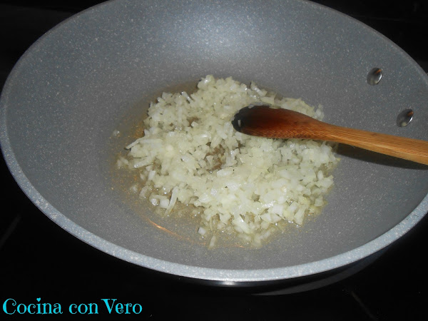 1/ En un wok grande ponemos un chorro de aceite de manera que cubra el fondo (capa fina), si se necesita vamos añadiendo más durante el proceso si vemos que queda seco (yo incluí un poquito más al integrar la carne más adelante del proceso), incorporamos el ajo en polvo y la cebolla picada al fuego. Añadimos una pizca de sal un poco, espolvoreándolo por encima hasta que se quede la cebolla blandita y transparente (no muy dorada) pochándolo.