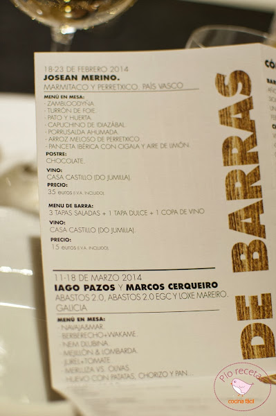 Anoche tuve la suerte de asistir a la presentación del primer menú de las Jornadas gastronómicas Barra de Barras 2014 que se celebran en el Restaurante el Churra de Murcia de la mano de Gastrólogos.El menú fue confeccionado por Josean Merino del restaurante Marmitaco y Perretxico situados en Vitoria y considerados mejor barra en el año 2011.Constaba de 7 tapas saladas y una dulce acompañadas por vinos Casa Castillo (DO Jumilla).