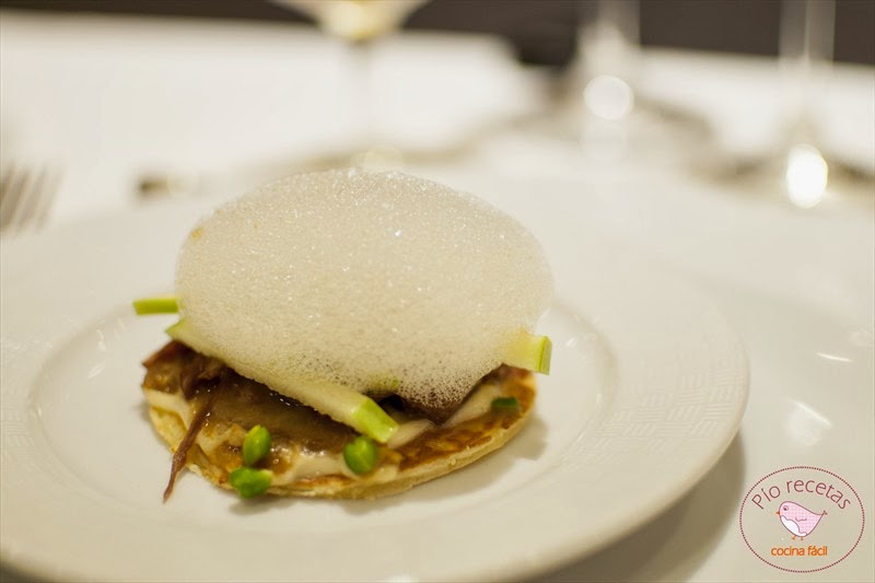 Pato y huerta una tapa de pato muy sabrosa,con guisantes frescos y espuma de citricos todo colocado sobre un blini.Ademas llevaba unas tiras de manzana verde que le aportaban frescura al plato.Estupendo para comer con las manos.