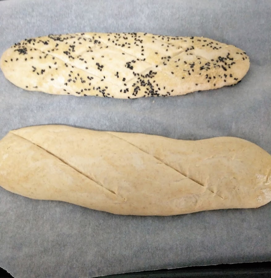 Ahora enharinamos la mesa donde vayamos a trabajar la masa y volcamos nuestra masa sobre la mesa, para ayudar a sacar la masa del bol nos vendrá bien tener las manos enharinadas. Ahora formamos una especie de rectángulo y la cortaremos por la mitad a lo largo, para tener dos porciones iguales. Procedemos a darles un poco de forma con las manos y las ponemos, sobre un papel de horno, en la bandeja del horno. Es hora de echarles unas semillas por encima, si queremos, yo he hecho una barra con unas semillas que tenía por casa de sésamo, negro y blanco y la otra sin nada. Para que se peguen las semillas untamos la barra con la mano mojada.