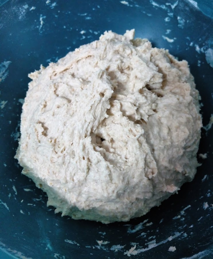 Empezaremos creando una masa que realizaremos por la tarde-noche, disolvemos la levadura en el agua templada con la ayuda de una cuchara. En un bol ponemos la harina junto con la sal e iremos incorporando el agua con la levadura poco a poco con una mano, con la otra vamos mezclando la masa, la masa tiene que quedar pegajosa, no se queda como una bola homogénea.