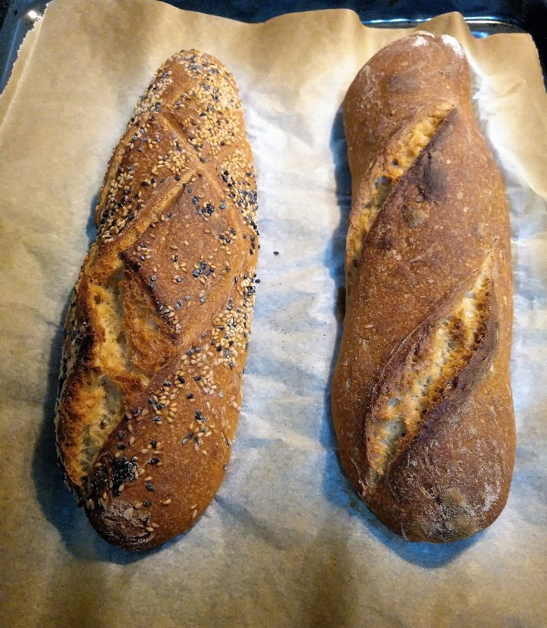 Tendremos que dejar que fermenten durante un par de horas sobre la encimera de la cocina antes de la cocción y antes del horneado le podremos dar unos cortes como decoración. La cocción será de 10 minutos a 220ºC y 20 a 200ºC, al principio de la cocción nos ayudaremos con un vaso de agua que echaremos sobre una bandeja vacía y caliente que tendremos en el suelo del horno para darle un golpe de vapor al principio de la cocción, si cuando bajemos la temperatura aún nos queda agua en la bandeja, la retiraremos.