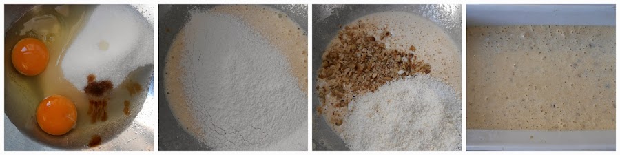 En un bol batir los huevos con el azúcar y la esencia de vainilla. Añadir la harina tamizada con la levadura y la sal. Incorporar el coco rallado y las nueces, mezclando bien todo. Cuando hayan pasado los 10 minutos de cocción de la masa, retirar del horno y verter por encima esta mezcla de coco. Volver a colocar en el horno y cocinar 20 minutos más.