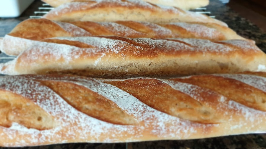 Para 8 barras, con un peso de la masa de aproximadamente 2k y 700 gramos (2700 g) Peso total de la harina 1612, hidratacion del 65%, 2% de sal y menos del 0,5% de levadura seca. El poolish un 20% del peso de la harina. Con estos datos puedes hacer la cantidad que quieras