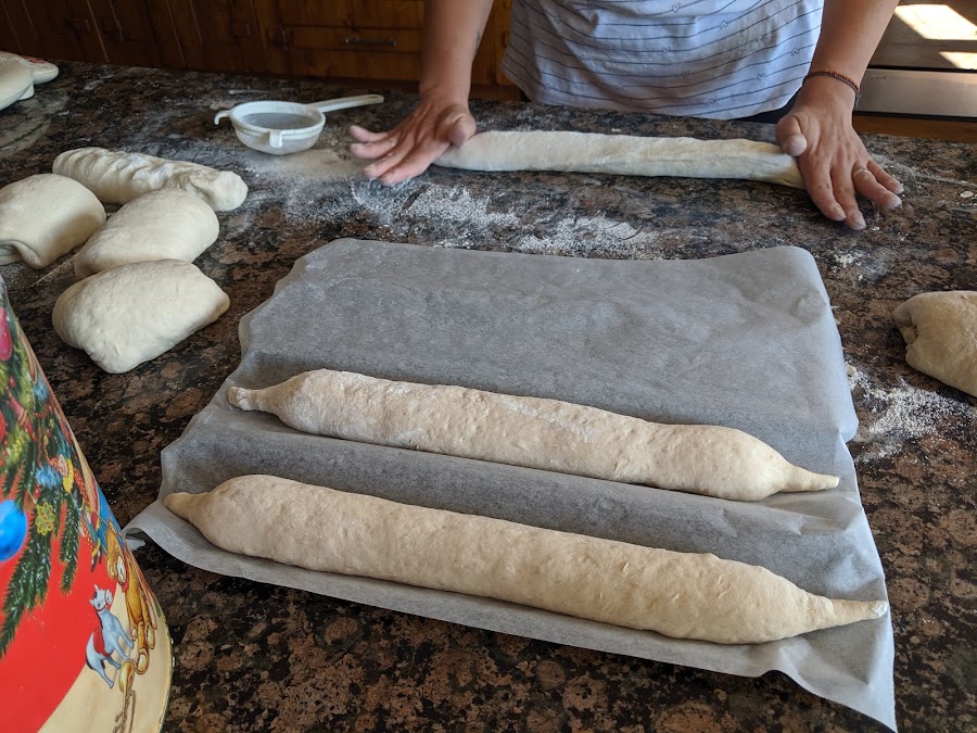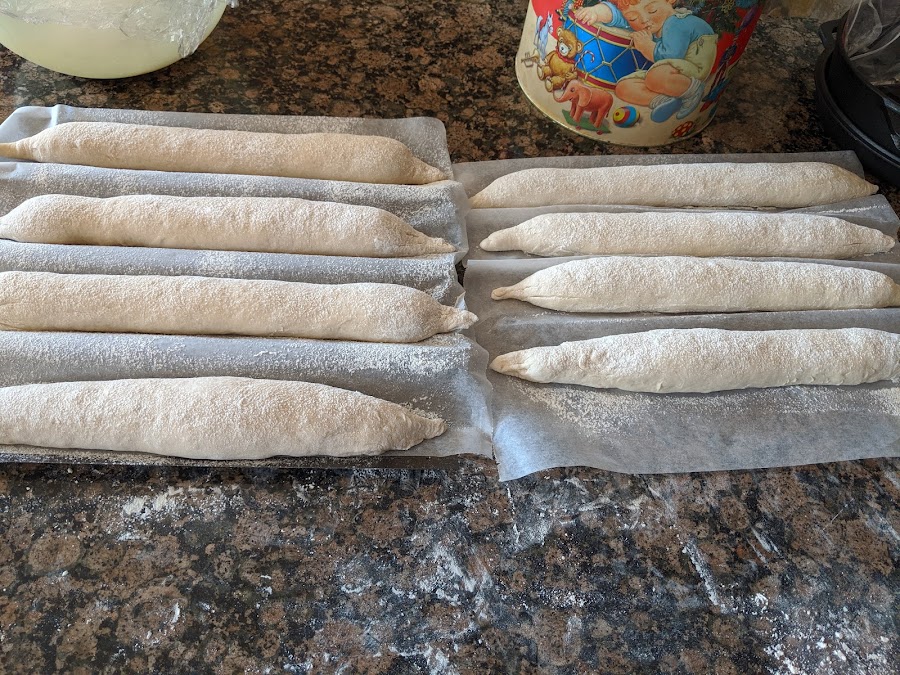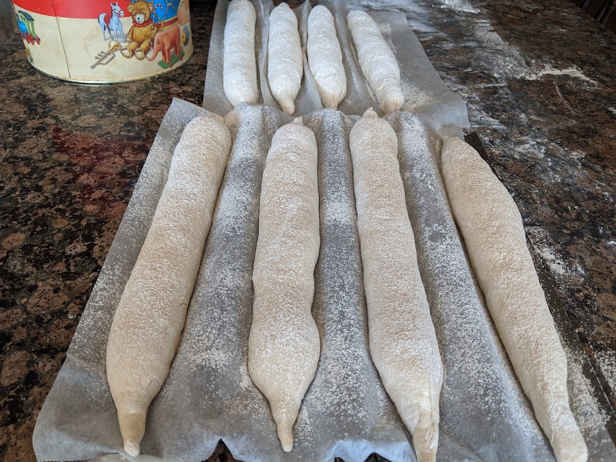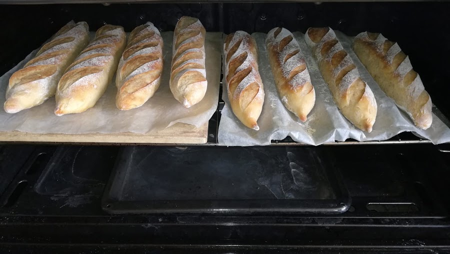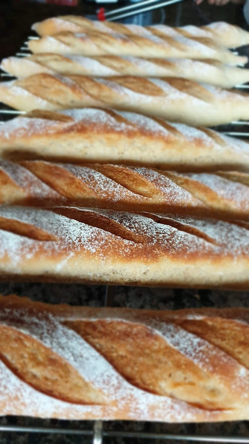 4 g de levadura secaPonemos todo en la amasadora, líquidos primero, y amasamos durante 3 minutos. Dejamos reposar 10 y volvemos a amasar 2 minutos. Si tu amasadora es pequeña, divide los ingredientes en 2 y amasa en 2 tandas. Dejamos que doble a temperatura ambiente. La nuestra a las 2 horas y media la metimos en la nevera, durante otras 2 horas y media más. Sacamos y preformamos las 8 barras (pesa las porciones para que salgan iguales)