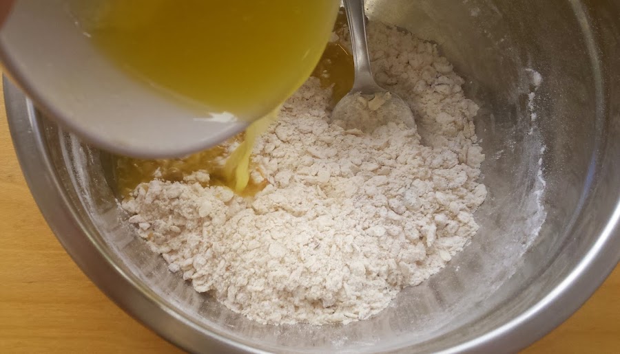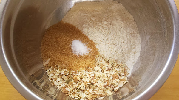 En un bol mezcla los copos de avena, la harina tamizada, el azúcar moreno, el jengibre y la sal.