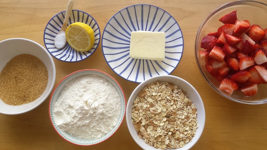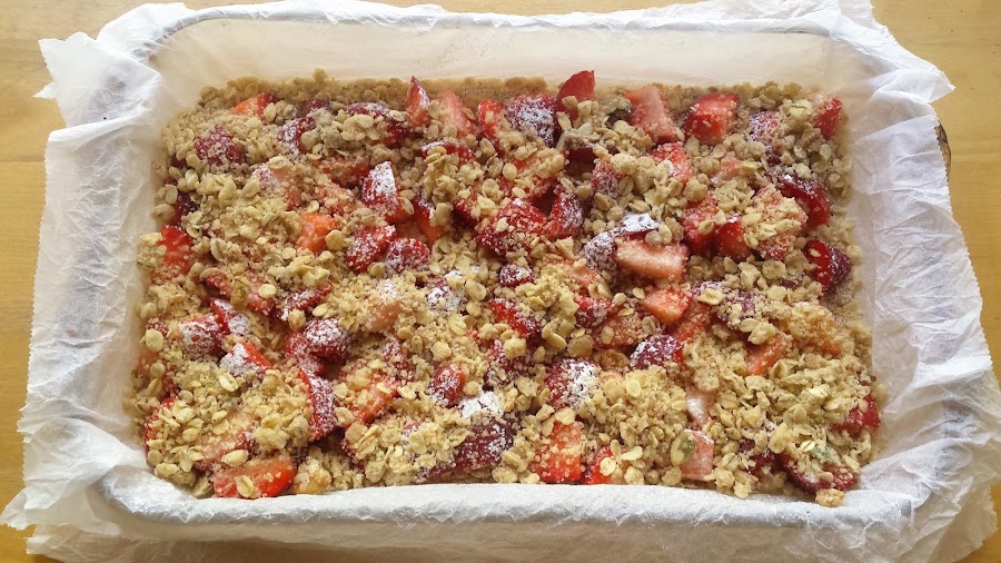 Por encima de las fresas cubiertas de azúcar y maicena reparte el resto de migas de harina y avena que tenías reservado, las fresas no deben quedar todas totalmente cubiertas si no que algunas deben asomar a través de la capa de avena.