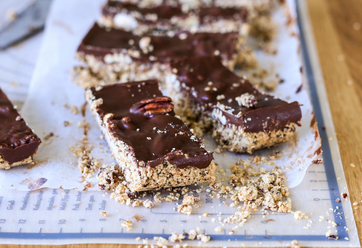 Barritas de avena y frutos secos bañadas en chocolate amargo. Riquísimas y mucho más baratas que en el kiosco.