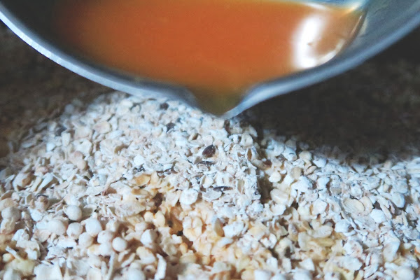 Luego, retirar del horno y agregar el zumo de naranja por encima de la avena y volver a hornear por unos 5 minutos más. Verás que la avena comenzará a ponerse con grumos. Puedes revolver, para incorporar bien el zumo. Luego retirar del horno.