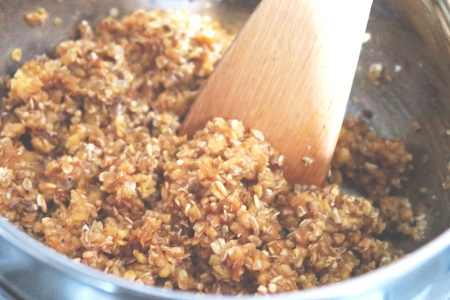 En una olla, a fuego bajo, agregar la miel y comenzar a incorporar la avena que recién sacamos del horno. Revolver con una cuchara o espátula de madera, de manera constante hasta que se forme una combinación muy espesa, cuidando que no se queme.