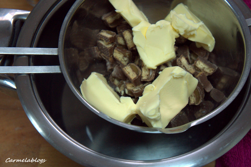 2) Poner agua en una olla, poner encima un cazo o cuenco que encaje en la olla pero que no llegue a tocar el agua. En el cuenco poner las barritas de chocolate con caramelo picadas con la mantequilla.