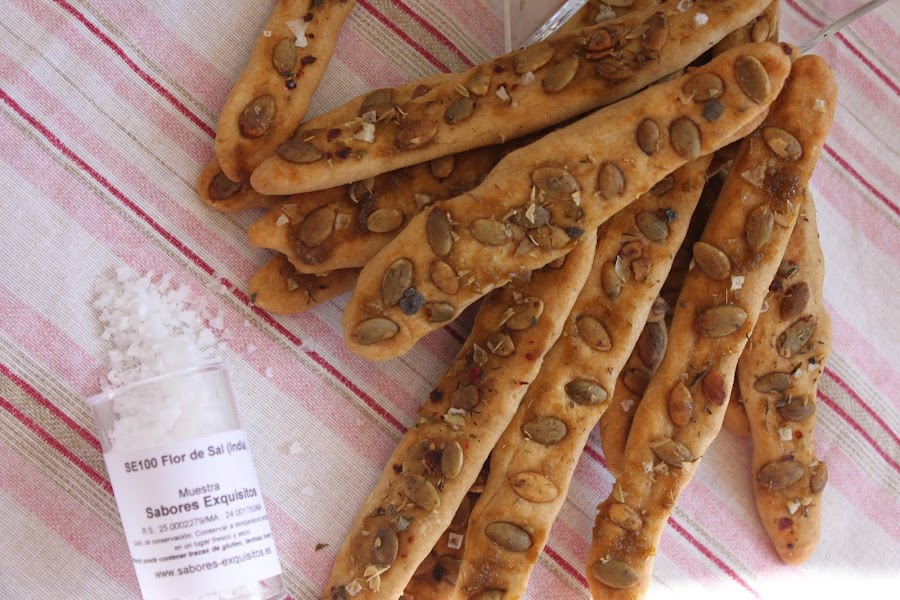 Hacer un rulo con la masa, cortar rodajas de unos 20g cada una y darle forma de barritas planas. Colocarla en la bandeja de horno sobre papel de hornear. Pincelar con la mermelada y decorar con las semillas, sal y yerbas.