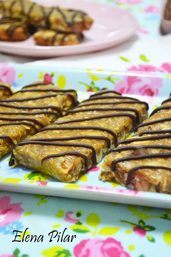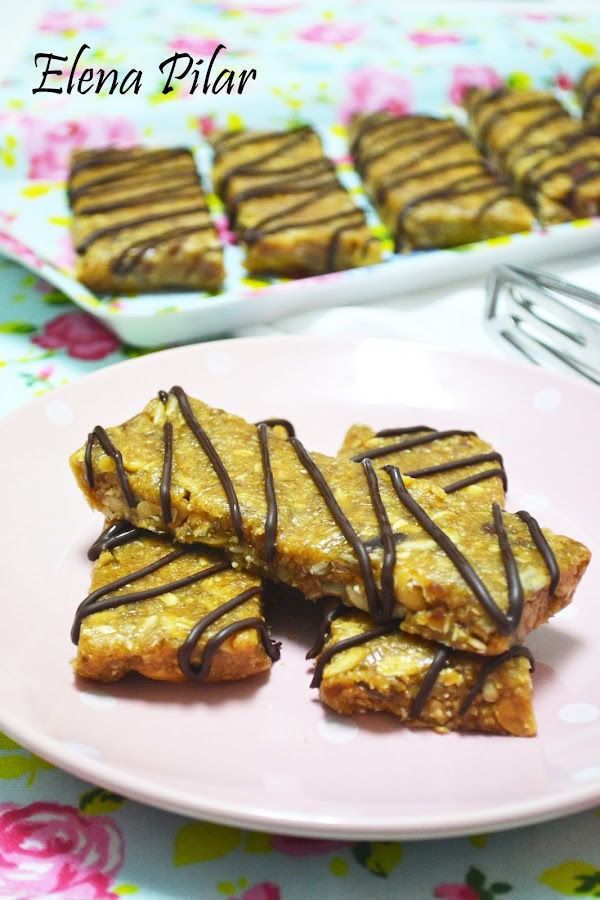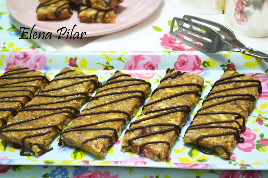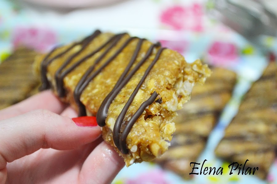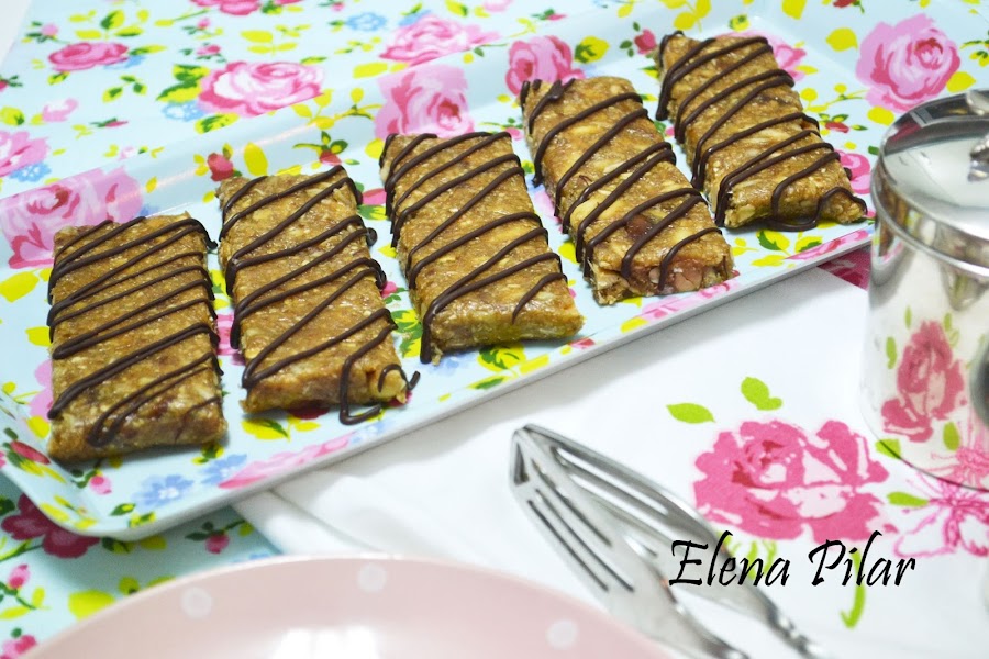 Fundimos el chocolate y lo repartimos en forma de zigzag sobre cada una de las barritas. Dejamos secar unos minutos el chocolate y reservamos las barritas en el frigorífico hasta el momento de comerlas.