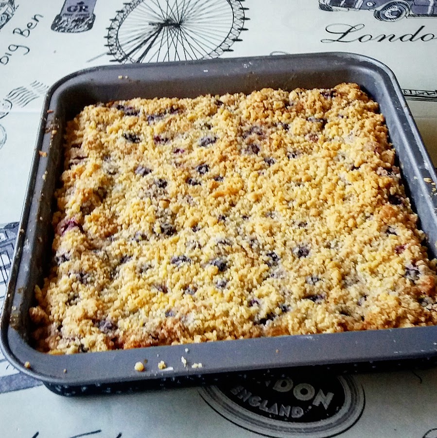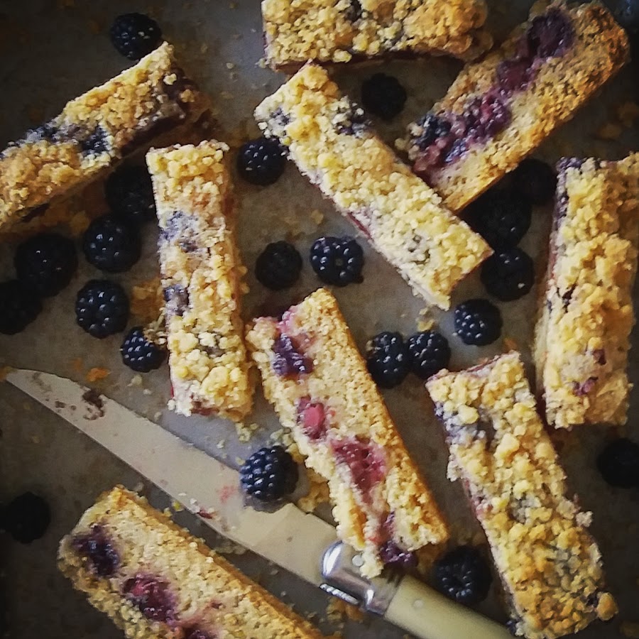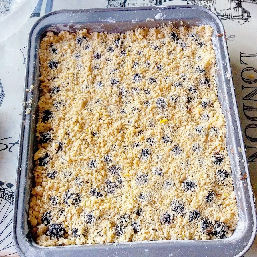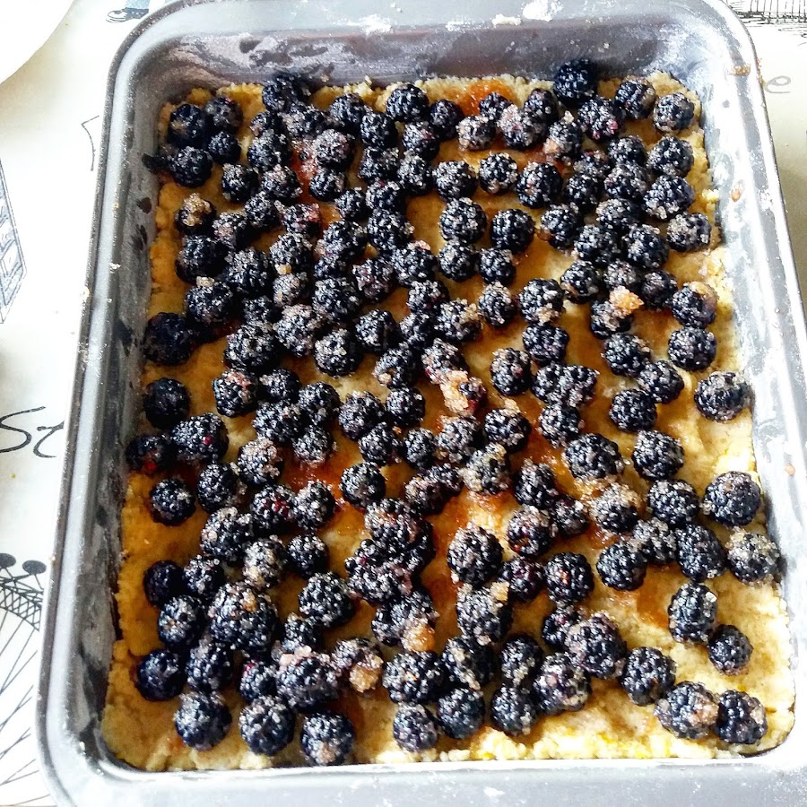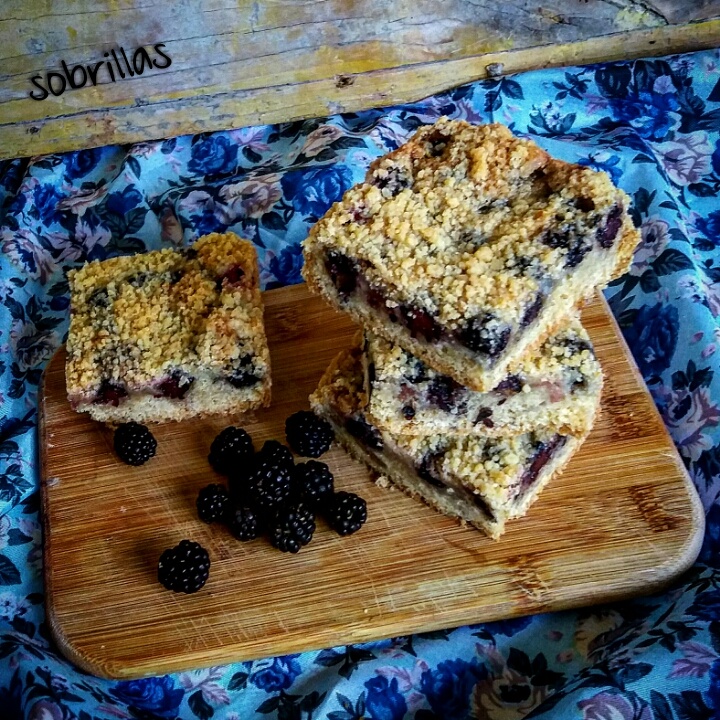Para terminar mezclamos la harina con el azúcar, la ralladura y la mantequilla fría. Trabajamos de nuevo con la yema de los dedos hasta conseguir una textura arenosa y cubrimos las moras.