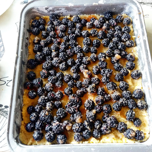 Para el relleno lavamos bien la moras que vayamos a usar ( sólo lavar las que vayáis a usar, así conservaremos el resto más tiempo ). Las mezclamos con el azúcar, el zumo de limón y la harina y esparcimos sobre la base.