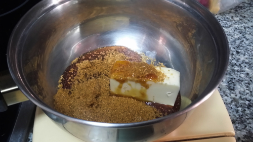 En una olla, ponemos la mantequilla, la miel y el azúcar