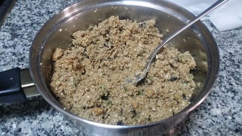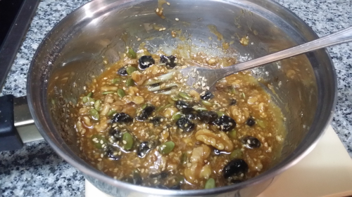 Retiramos del fuego y añadimos los copos de avena, las nueces, las uvas pasas, las pipas, el sésamo, el coco rallado, la canela y la sal.